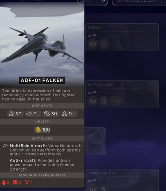 ADF-01 FALKEN adalah modifikasi untuk game Humankind yang dirancang khusus untuk menambah pesawat tempur baru ke dalam permainan. Mod ini memungkinkan pemain untuk menggunakan pesawat yang dioperasikan oleh AI tanpa memerlukan populasi, yang membuka peluang strategis baru dalam pertempuran. Pesawat ini dapat diakses setelah pemain meneliti teknologi Militer Laser, menambah dimensi baru dalam pengembangan taktik dan strategi di dalam game.
